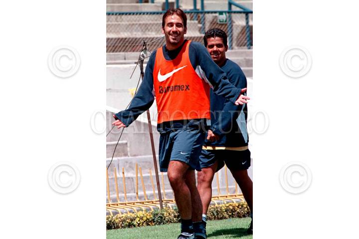 Rafael Amador y Alejandro Glaria, ambos integrantes del equipo Pumas, durante el entrenamiento de los universitarios en el estadio México 68. FOTO: Pedro Mera/CUARTOSCURO.COM