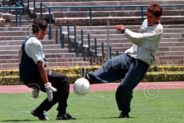Rafael Amador y Alejandro Glaria, ambos integrantes del equipo Pumas, durante el entrenamiento de los universitarios en el estadio México 68. FOTO: Pedro Mera/CUARTOSCURO.COM