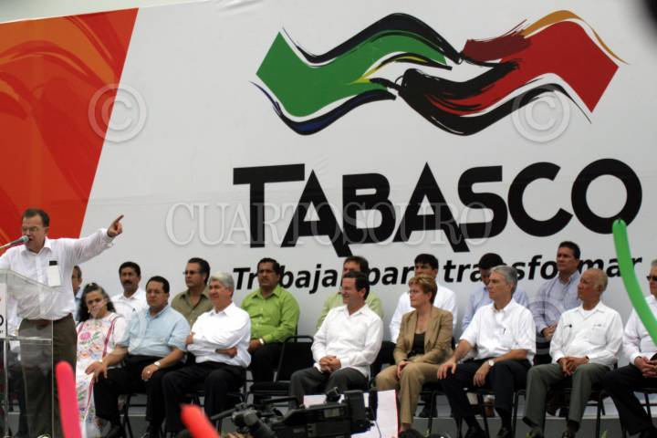 VILLAHERMOSA, TABASCO, 31DICIEMBRE2006.- Andres "El Quimico" Granier Melo, tras tomar protesta como gobernador, en compañia de Francisco Ramirez Acuña, Secretario de Gobernación, y el gobernador saliente; Manuel Andrade Díaz frente a la Cámara de Diputados. FOTO: MARCO POLO GUZMÁN HERNÁNDEZ/CUARTOSCURO.COM