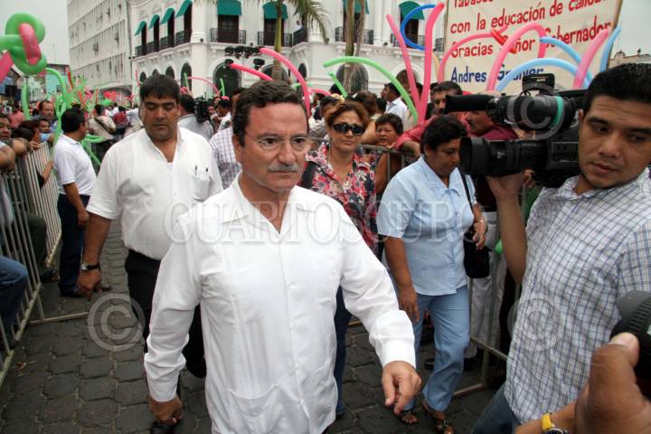 VILLAHERMOSA, TABASCO, 31DICIEMBRE2006.- Andres "El Quimico" Granier Melo, tras tomar protesta como gobernador, en compañia de Francisco Ramirez Acuña, Secretario de Gobernación, y el gobernador saliente; Manuel Andrade Díaz frente a la Cámara de Diputados. FOTO: MARCO POLO GUZMÁN HERNÁNDEZ/CUARTOSCURO.COM