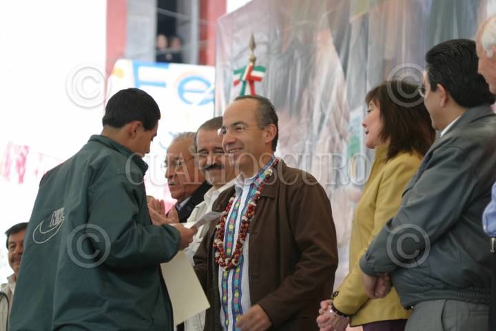 HUEYTLALPAN, PUEBLA 09ENERO2007.- El presidente Felipe Calderon Hinojosa durante su gira de trabajo, durante la cual visito Hueytlalpan donde se anuncio que SEDESOL y FONHAPO invertiran 50 millones de pesos para pisos firmes en Puebla. FOTO:FONHAPO/CUARTOSCURO.COM
