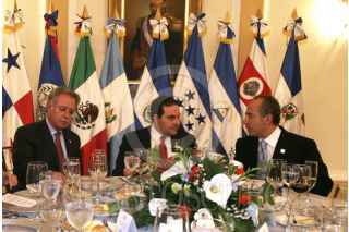 SAN SALVADOR,SALVADOR16ENERO2007.- Felipe Calderón Hinojosa, presidente de México conversa con sus homologos de el Salvador, Elias Antonio Saca y Oscar Berger, de Guatemala duarnte la cena ofrecida a los asistentes al XV aniversario de los acuerdos de Paz en en dicha nación. FOTO: ALFREDO GUERRERO/CUARTOSCURO.COM