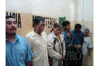 CHILPANCINGO, GUERRERO; 25ENERO2007.- Los presuntos secuestradores Flaviano Arizmendi Catalan, Dalia Sarabia Zuñiga, Everardo Perez Sierra, Jacinto Medina Garcia, Salome o Salomon Castro Castro y Alejandro Carvajal Aguilar durante su presentacion en las instalaciones de la Procuraduria General de Justicia del Estado (PGJE) luego de que fueran detenidos en la poblacion de Zumpago por policias ministeriales acusados de secuestro. FOTO:OSCAR ALAVARADO/CUARTOSCURO.COM