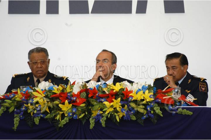 MÉXICO D.F. 10FEBRERO2007.- El presidente Felipe Calderón Hinojosa, acompañado del secretario de defensa Guillermo Galvan Galvan y del secretario de marina, Mariano Francisco Saynez Medoza, a su salida de la seremonia conmemorativa por el "Día de La Fuerza Aérea Mexicana" que se realizo en la base aerea de Santa Lucía. FOTO: GUILLERMO PEREA/CUARTOSCURO.COM