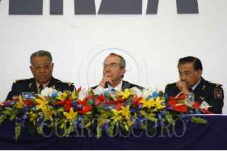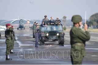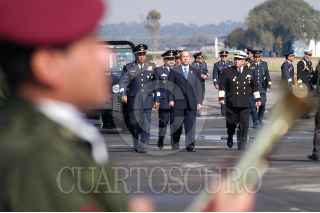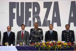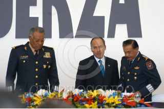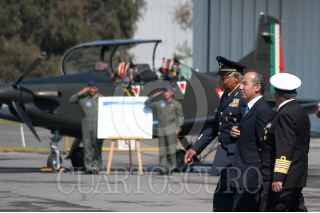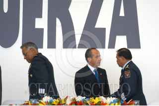 MÉXICO D.F. 10FEBRERO2007.- El presidente Felipe Calderón Hinojosa, acompañado del secretario de defensa Guillermo Galvan Galvan y del secretario de marina, Mariano Francisco Saynez Medoza, a su salida de la seremonia conmemorativa por el "Día de La Fuerza Aérea Mexicana" que se realizo en la base aerea de Santa Lucía. FOTO: GUILLERMO PEREA/CUARTOSCURO.COM