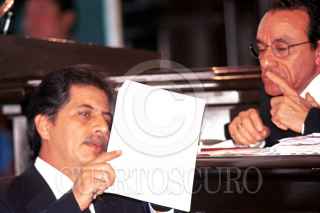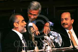 Jesús Ortega coordinador de la fracción parlamentaria del PRD en el Senado muestra un documento al secretario tecnico de la mesa directiva. FOTO: Oswaldo Ramírez/CUARTOSCURO.COM