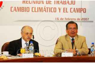 MÉXICO D.F. 16FEBRERO2007.- Mario Molina Pasquel, premio Nobel de quimica 1995 y el senador Heladio Ramiréz del PRI de la comisión de Desarrollo Rural durante la reunión de trabajo con especialistas para analizar el impacto del cambio ambiental y sus concecuencias en el campo mexicano. FOTO: SENADO/CUARTOSCURO.COM