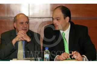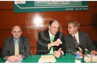 MEXICO, D.F. 28 FEBRERO2007.- Eduardo Sojo, secretario de Economia, Yericó Abramo Masso, presidente de la Comisión especial para conocer las responsabilidades y origen de la tragedia de la mina de carbón Pasta de Conchos y Juan Salvador Munguía durante la reunón de trabajo que sostuvieron. FOTO: NELLY SALAS/CUARTOSCURO.COM