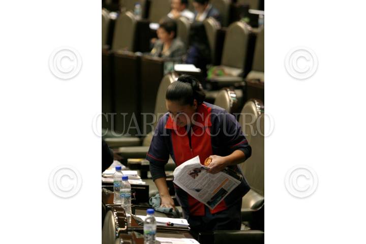 MÉXICO, D.F., 08MARZO2007.- Una mujer encargada de la limpieza de las curules de la Cámara de Diputados realiza su labor durante la sesión en la Cámara de Diputados. FOTO: MOISÉS PABLO/CUARTOSCURO.COM