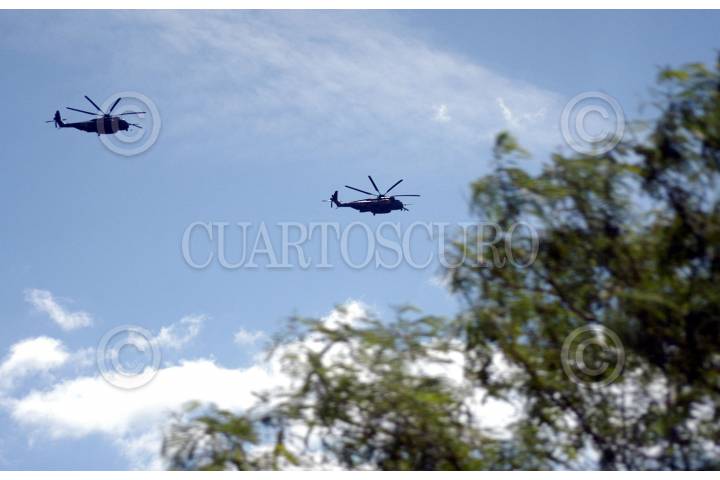 UXMAL, YUCATÁN 13MARZO2007.- Helicopteros del ejercito de los Estados Unidos, vigilan desde los aires la zona arqueologica donde realizarón un recorrido los mandatarios de los Estados Unidos y de México. FOTO: GUILLERMO PEREA/CUARTOSCURO.COM