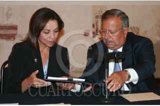 MÉXICO, D.F.13ABRIL2007.-El Secretario General Ejecutivo del CEN del SNTE, Rafael Ochoa Guzmán, le entrega el Pliego General de Demandas del gremio a la secretaria de Educación Pública, Josefina Vazquez Mota. FOTO CUARTOSCURO.COM