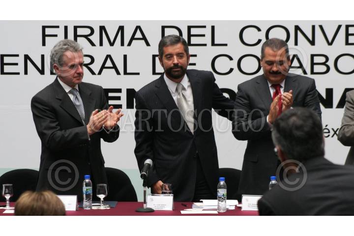 MÉXICO D.F. 24ABRIL2007.- Los legisladores Manlio Fabio Beltrones, Carlos Navarrete y el rector de la UNAM, Juan Ramón de la Fuente, durante la firma de convenio entre la UNAM y el Senado. FOTO: PAOLA HIDALGO/CUARTOSCURO.COM