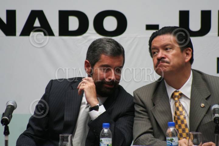 MÉXICO D.F. 24ABRIL2007.- Los legisladores Manlio Fabio Beltrones, Carlos Navarrete y el rector de la UNAM, Juan Ramón de la Fuente, durante la firma de convenio entre la UNAM y el Senado. FOTO: PAOLA HIDALGO/CUARTOSCURO.COM