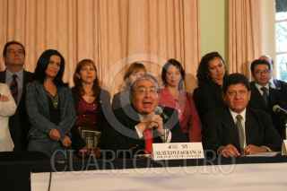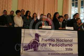 MEXICODF24ABRIL2007.-PREMIO NACIONAL DE PERIODISMO. Alberto Barranco Chavarria, presidente del jurado y Carlos Jorge Briseño, rector de la UdeG, durante la conferencia en la que se dieron a conocer a los gandores del Premio Nacional 2006, atrás miembros del jurado, en la Casa del Lago. FOTO: PEDRO VALTIERRA/CUARTOSCURO.COM