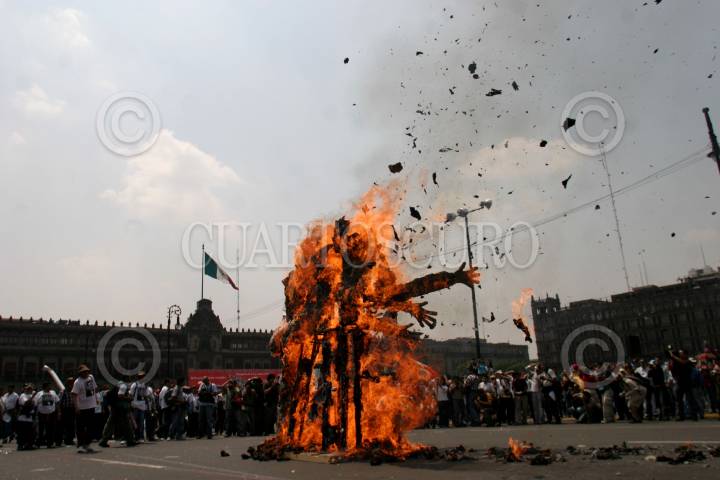 MÉXICO, D.F., 01MAYO2007.- Integrantes de varios sindicatos adherentes a la Unión Nacional de Trabajadores quemaron unos monigotes alusivos al presidente de la república enfrente de la Cátedral Metropolitana. FOTO: MOISÉS PABLO/CUARTOSCURO.COM