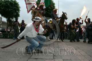 MÉXICO, D.F. 04MAYO2007.- Habitantes de San Salvador Atenco, acompañados de simpatizantes, marcharon a un año del encarcelamiento de los presos políticos, a su llegada al Zócalo capitalino protestaron frente a las puertas de Palacio Nacional. FOTO: PAOLA HIDALGO/CUARTOSCURO.COM