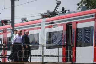 MÉXICO D.F. 14MAYO2007.-El presidente Felipe Calderón Hinojosa acompañadode de Enrrique Peña Nieto gobernador del Estado de México y de Luis Tellez Secretario de Comunicaciónes y Transportes momentos antes de abordar el tren para realizar un desplazamiento de prueba, durante su recorrido de supervisión de los trabajos del Tren Suburbano. FOTO: GUILLERMO PEREA/CUARTOSCURO.COM