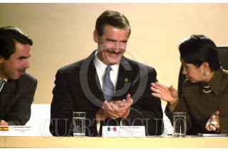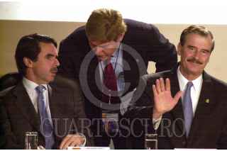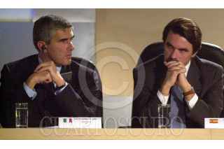 Pier Ferdinando Casini, presidente de la Cámara de Diputados de Italia, observa al presidente español Jose María Aznar, durante la sesión plenaria de la ICD, donde se anunció que el mandatario español será el nuevo presidente de la organización. FOTO: Pedro Mera/CUARTOSCURO.COM