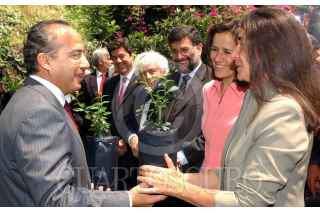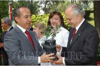 MÉXICO D.F. 25MAYO2007.-El presidente de la república le entrega un arbolito a Julia Caravias quien se encontraba acompañada de Margarita Zavala y Francisco Barnes, en el marco de la Estrategia Nacional de Cambio Climatico, oficiada en la residencia oficial de los Pinos. FOTO: ARIEL GUTIERREZ/CUARTOSCURO.COM