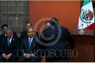MÉXICO, D.F. 31MAYO2007.- El presidente Felipe Calderón Hinojosa presentó su plan de desarrollo en Palacio Nacional.da Jorge Zermeño, presidente de la mesa directiva en la Cámara de Diputados y Agustín Carstens, secretario de hacienda estuvieron presentes. FOTO: PAOLA HIDALGO/CUARTOSCURO.COM