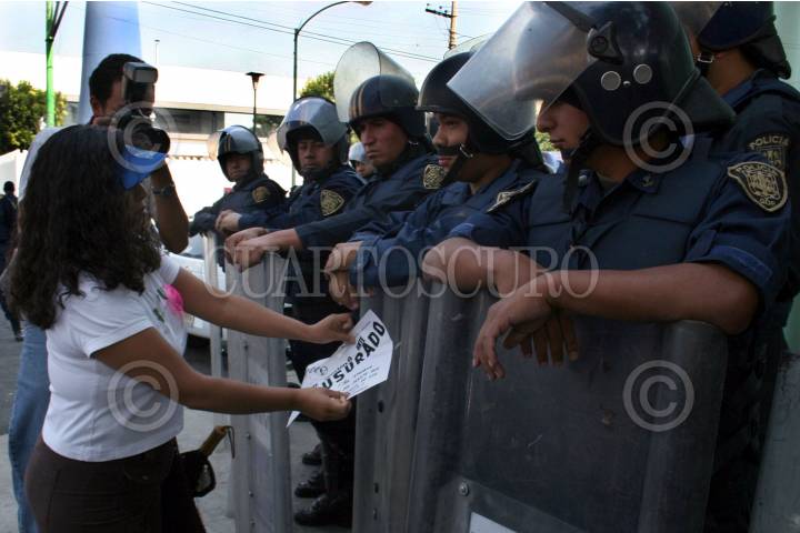 MÉXICO, D.F. 01JUNIO2007.-Integrantes de la CNTE realizaron una marcha que partió del Comité Ejecutivo Nacional del PAN hacia el Zócalo capitalino. Los manifestntes colocaron una pancarta para clausurar simbolicamente la sede de dicho partido. FOTO: PAOLA HIDALGO/CUARTOSCURO.COM