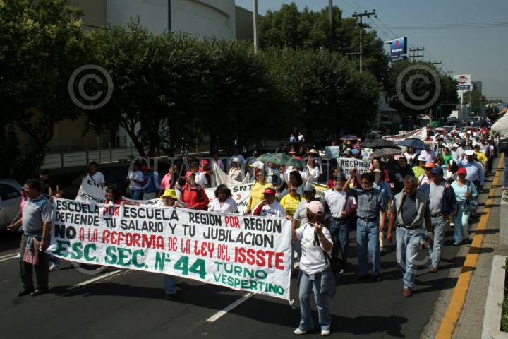 MÉXICO, D.F. 01JUNIO2007.-Integrantes de la CNTE realizaron una marcha que partió del Comité Ejecutivo Nacional del PAN hacia el Zócalo capitalino. Los manifestntes colocaron una pancarta para clausurar simbolicamente la sede de dicho partido. FOTO: PAOLA HIDALGO/CUARTOSCURO.COM