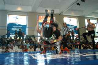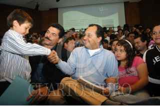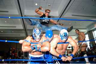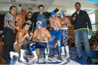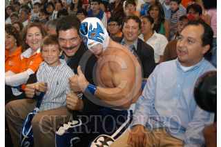 MÉXICO D.F. 17JUNIO2007.-El diputado Gerardo Pliego en las instalaciones del CEN del PAN donde con una función de lucha libre, celebraron el día del padre.En el imagen el diputado posa para la foto con los luchadores. FOTO: GUILLERMO PEREA/CUARTOSCURO.COM