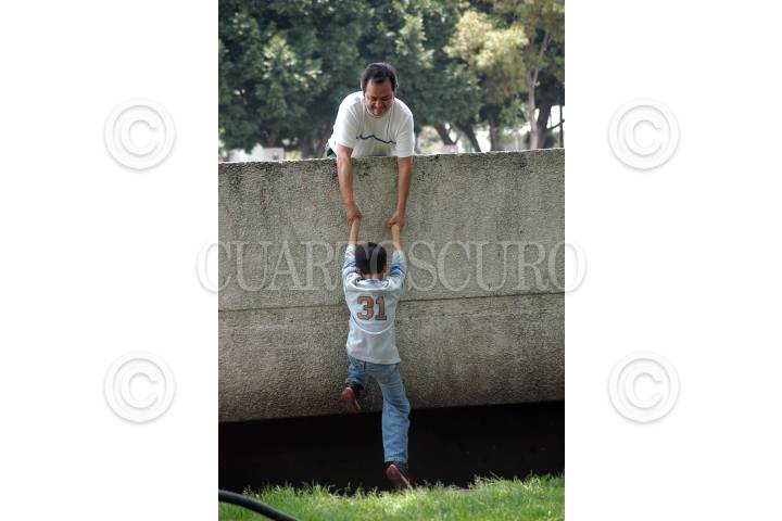 MÉXICO D.F. 17JUNIO2007.-Un padre de famila ayuda a su hijo a subir a una barda después de recoger una pelota, esto durante la celebración el día del padre. FOTO: GUILLERMO PEREA/CUARTOSCURO.COM