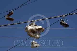 ZACATECAS, ZAC.17JUNIO2007.- Por alguna razón de la que no hay explicación en distintas partes de la ciudad se observan zapato y tenis colgados en los cables de la luz, lo que provoca perdida de energia. FOTO PEDRO VALTIERRA/CUARTOSCURO.COM