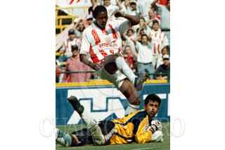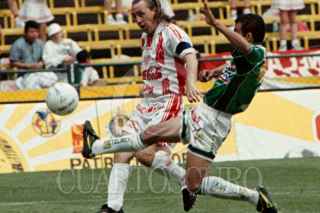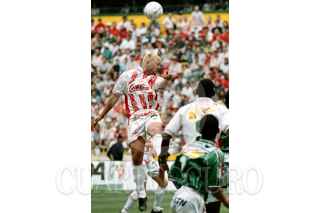 Esta tarde Necaxa y Leon empataron a un gol en la cancha del azteca. En la gráfica Alex Aguinaga dribla a la defensiva de los panzas verdes.