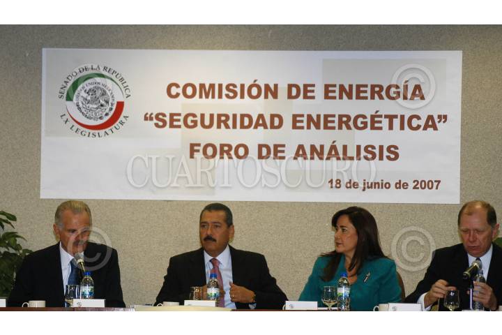 MÉXICO D.F. 18JUNIO2007.-Los senadores Francisco Labastida, Manlio Fabio Beltrones, Yeidckol Polevnsky y Carlos Morales director de exploraciones de PEMEX, durante la realización del foro de "Seguridad Energética" realizado en las instalaciones del Senado de la República. FOTO: GUILLERMO PEREA/CUARTOSCURO.COM