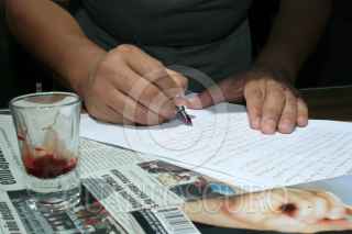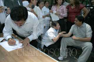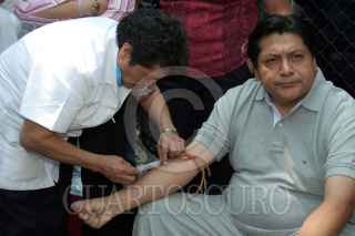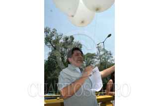 MÉXICO, D.F. 09JULIO2007.- El senador perredista Hector Bautista, quien se mantiene en huelga de hambre acudió a las inmediaciones de la residencia oficial de Los Pinos, donde se sacó sangre para elaborar una carta dirijida al presidente Felipe Calderón, que amarró a unos globos blancos y los soltó al aire. FOTO: PAOLA HIDALGO/CUARTOSCURO.COM