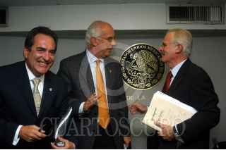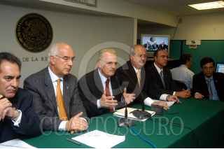 MÉXICO D.F. 17JULIO2007.-Los Senadores Carlos Lozano de la Torre del PRI, Dante Delgado de Convergencia y Francisco Labastida Ochoa del PRI, Graco Ramirez Garrido del PRD, durante la conferencia ofrecida esta tarde en las instalaciones del Senado de la República. FOTO: GUILLERMO PEREA/CUARTOSCURO.COM