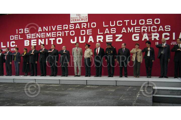 XALAPA, VERACRUZ, 18JULIO2007.- En el parque Juárez se realizó la conmemoración del 135 Aniversario Luctuoso del Benemérito de las Américas, Benito Juárez. El gobernador Fidel Herrera, acompañado de su gabinete, encabezó la ceremonia, y mandó un mensaje en contra de los gobernantes que entregan los recursos del pueblo a intereses extranjeros. FOTO: JORGE VALDÉS/CUARTOSCURO.COM