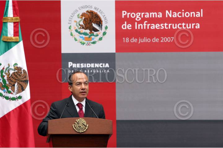 MÉXICO, D.F., 18JULIO2007.- Juan Camilo Mouriño, Jefe de la Oficina de la Presidencia, Guillermo Ortiz, Gobernador del Banco de México y Felipe Calderón Hinojosa, Presidente de la República, durante la presentación del plan nacional de infraestructura 2007 en el Palacio Nacional. FOTO: MOISÉS PABLO/CUARTOSCURO.COM