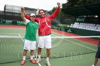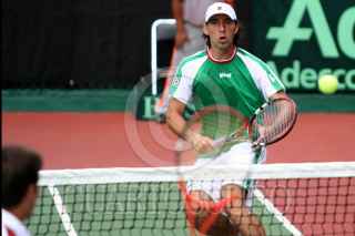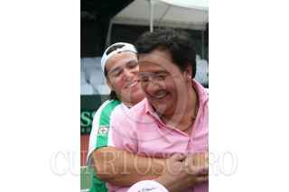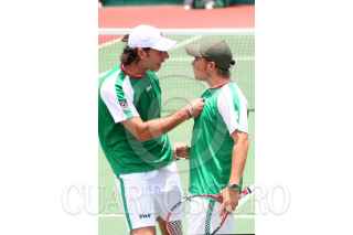 TOLUCA, EDOMEX. 21JULIO2007.- Daniel Garza y Santiago Gonzalez, jugadores del equipo mexicano; Roberto Mayutin y Daniel vallverdu, jugadores del equipo venezolano, Durante el partido de la Copa Davis Mexico-Venezuela en la categoría Dobles donde el equipo mexicano obtuvo en trinfo ganando 3 sets a 2 , llevada a cabo en la ciudad de Metepec Estado de Mexico. El equipo mexicano aventaja la serie Copa Davis 3 juegos a cero.En imagen El presidente municipal de Metepec Oscar Gonzalez y Daniel Garza FOTO: CARLOS TISCHLER/CUARTOSCURO.COM