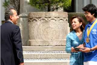 MÉXICO, D.F., 15AGOSTO2007.- Felipe Calderón Hinojosa, Presidente de México, Emanuel Johansen Campos, uno de los ganadores del Octavo Campeonato del National Geographic y Josefina Vázquez Mota, Secretaría de Educación Pública, durante la entrega de reconocimientos a los jovenes en la residencia oficial de los Pinos. FOTO: MOISÉS PABLO/CUARTOSCURO.COM