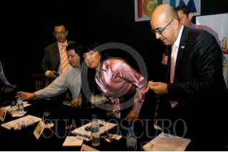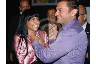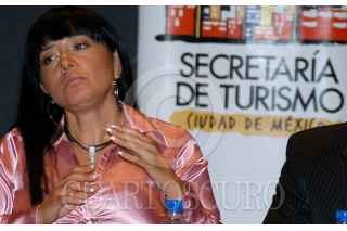 MÉXICO D.F. 16AGOSTO2007.- Alejandra Barrales, Secretaría de Turismo del gobierno capitalino, durante la en conferencia de prensa frecida con motivo de la presencia en México de los directivos de IGLA, en la cual se menciono el interes de promover el turismo de placer y negocios entre la comunidad gay y lésbica en nuestro país y a nivell mundial.En la imagen Tom Nibbo de IGLA, le coloca un botón de su asociación al termino de la conferencia. FOTO: GUILLERMO PEREA/CUARTOSCURO.COM