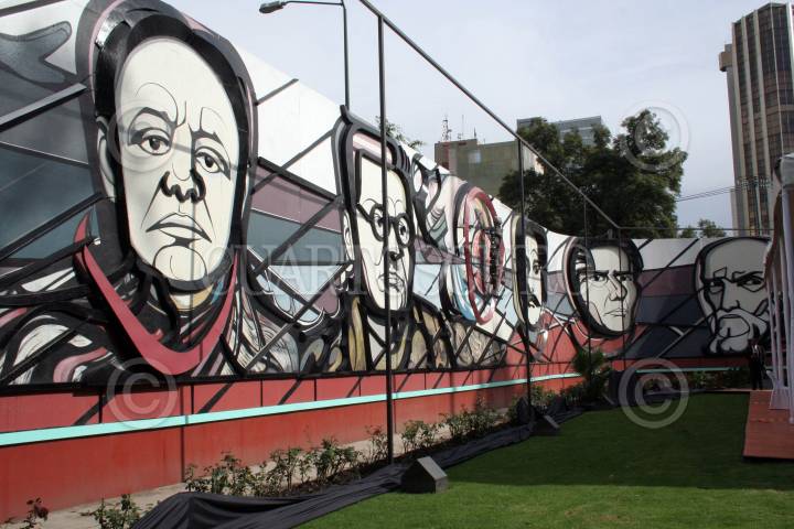 MÉXICO, 23AGOSTO2007.- El delegado en Benito Juárez, Germán de la Garza Estrada, María Teresa Franco, directora del INBA, Sergio Vela, presidente de Conaculta,y Adriana Alfaro, hija del muralista David Alfaro Siqueiros, durante la develación del mural "Homenaje al Cincuentenario del Momvimiento Muralista Mexicano", realizado por el artista mexicano. FOTO: ISAAC ESQUIVEL/CUARTOSCURO.COM