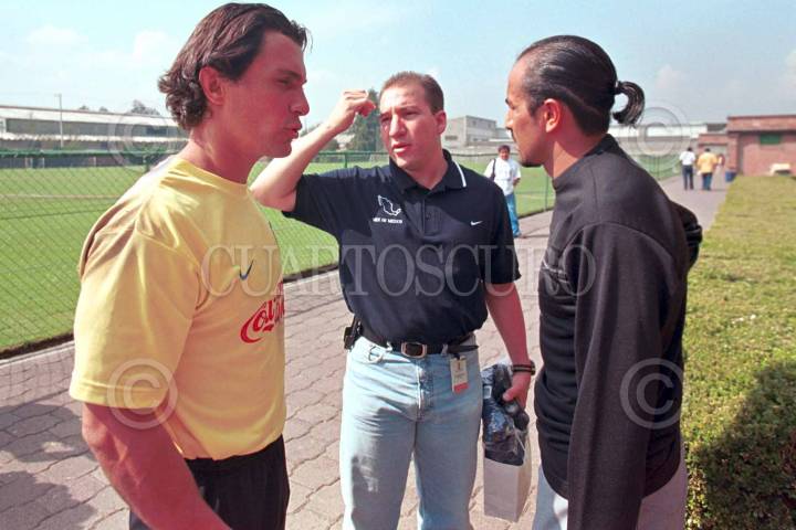 Alberto "Flaco" Macias, firma autógrafos al término del entrenamiento de las Aguilas del América. FOTO: Pedro Mera/CUARTOSCURO.COM