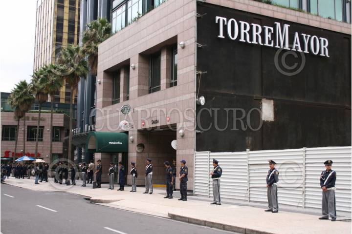 MEXÍCO. D.F. 30AGOSTO2007.- Fuerzas especiales de seguridad publica entraron a la Torre Mayor con perros entrenados para detectar aparatos explosivos por un aparante atententado de bomba, por locual usaron trajes especiales para encontrar dicho artefacto. FOTO:RICARDO CASTELAN/CUARTOSCURO.COM