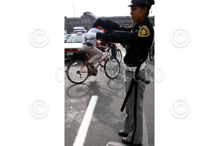 MÉXICO, D.F.,03SEPTIEMBRE2007.- Una policia da el paso a ciclistas que acompañaron en su recorrido en bicicleta a Marcelo Ebrard Casaubón. FOTO:SASHENKA GUTIERREZ/CUARTOSCURO.COM