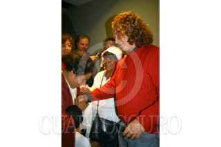 MÉXICO, D.F.,03SEPTIEMBRE2007.- Una señora en forma de agradecimiento besa la mano de Luis Mandoki Autor y Director del Documental "Un país sin presidente" esta mañana durante la presentación del polemico documental. FOTO:SASHENKA GUTIERREZ/CUARTOSCURO.COM