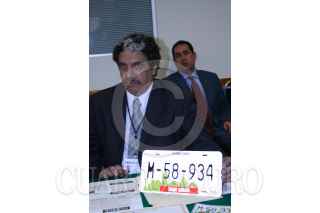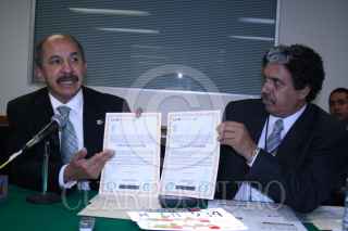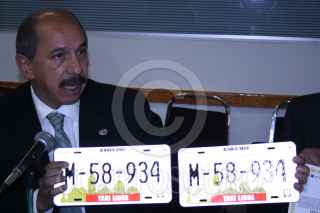 MEXÍCO.D.F. 05SEPTIEMBRE2007.-Armando Quintero Secretario de Trasporte y Vialidad y Victor Manuel Ramirez, Director General de Tracito Publico mostrarón las nuevas placas de trancito y las concesiones que seran otorgadas a los taxista las cuales seran iguales para taxistas tolerados,ecologicos, de sitio y los llamdos radio taxis, con estas nuevas placas pretenden evitar fraudes en el uso de las conseciones FOTO:RICARDO CASTELAN/CUARTOSCURO.COM