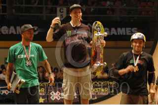 MÉXICO,D,F.,09SEPTIEMBRE2007.- Rodrigo Menezes segundo lugar, Pierre Luc Gagnon primer lugar y Rodrigo Menezes tercer lugar de la final del skate vert de los X Games en el Palacio de los Deportes., durante la premiacion. FOTO:SASHENKA GUTIERREZ/CUARTOSCURO.COM