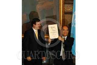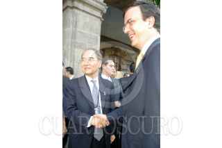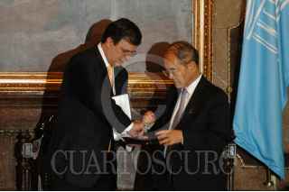 MEXICO, D.F., 21SEPTIEMBRE2007.-Marcelo Ebrad entrega las "llaves de la ciudad" al huesped distinguido Dr. Koichiro Matsuura Director General de la UNESCO. FOTO:IVAN MENDEZ/CUARTOSCURO.COM