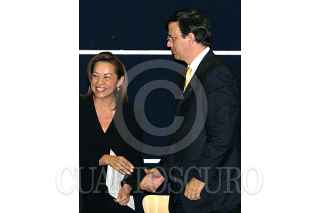 MÉXICO,D,F.,22SEPTIEMBRE2007.- Marcelo Ebrard saluda a Josefina Vazquez Mota durante la entrega del pergamino oficial que reconoce a Ciudad Universitaria como Patrimonio Cultural de la Humanidad. FOTO:SAÚL LÓPEZ/CUARTOSCURO.COM