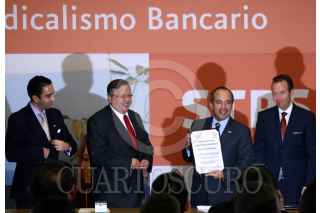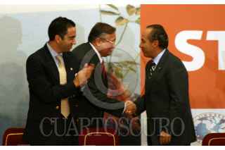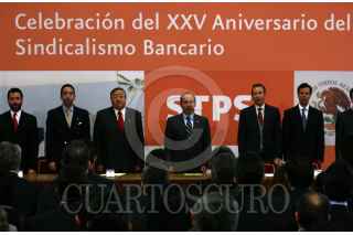 MEXICO, D.F., 28SEPTIEMBRE2007.-El presidente Felipe Calderon Hinojosa, el Secretario del Trabajo Javier Lozano Alarcon y Enrique Aguilar Borrego durante la celebracion del aniversario 25 del Sindicalismo Bancario en Mexico. FOTO:SASHENKA GUTIERREZ/CUARTOSCURO.COM