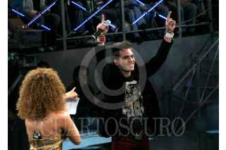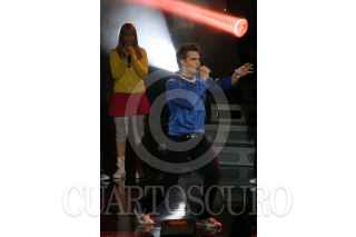 MÉXICO, D.F., 30SEPTIEMBRE2007.- Un maquillista arregla detras de camara a la conductora Galilea Montijo durante el programa "Buscando a Timbiriche la Nueva Banda". FOTO: SAÚL LÓPEZ/CUARTOSCURO.COM