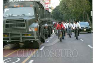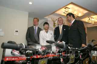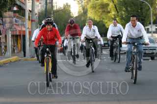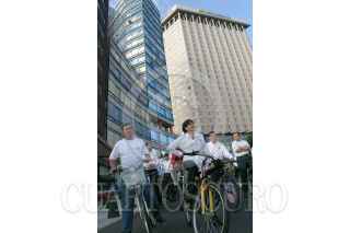 MEXICO,D.F. 01OCTUBRE2007.- Alejandra Barrales, secretaria local de Turismo, Kai Lamle,director gerente de GMMR, y Gonzálo Brockman, presidente de la Asociación de hoteles de la ciudad de México durante el evento de Donación de bicicletas para el programa"Recorridos turisticos en bicicleta".FOTO:ROCIO ORTIZ/CUARTOSCURO.COM